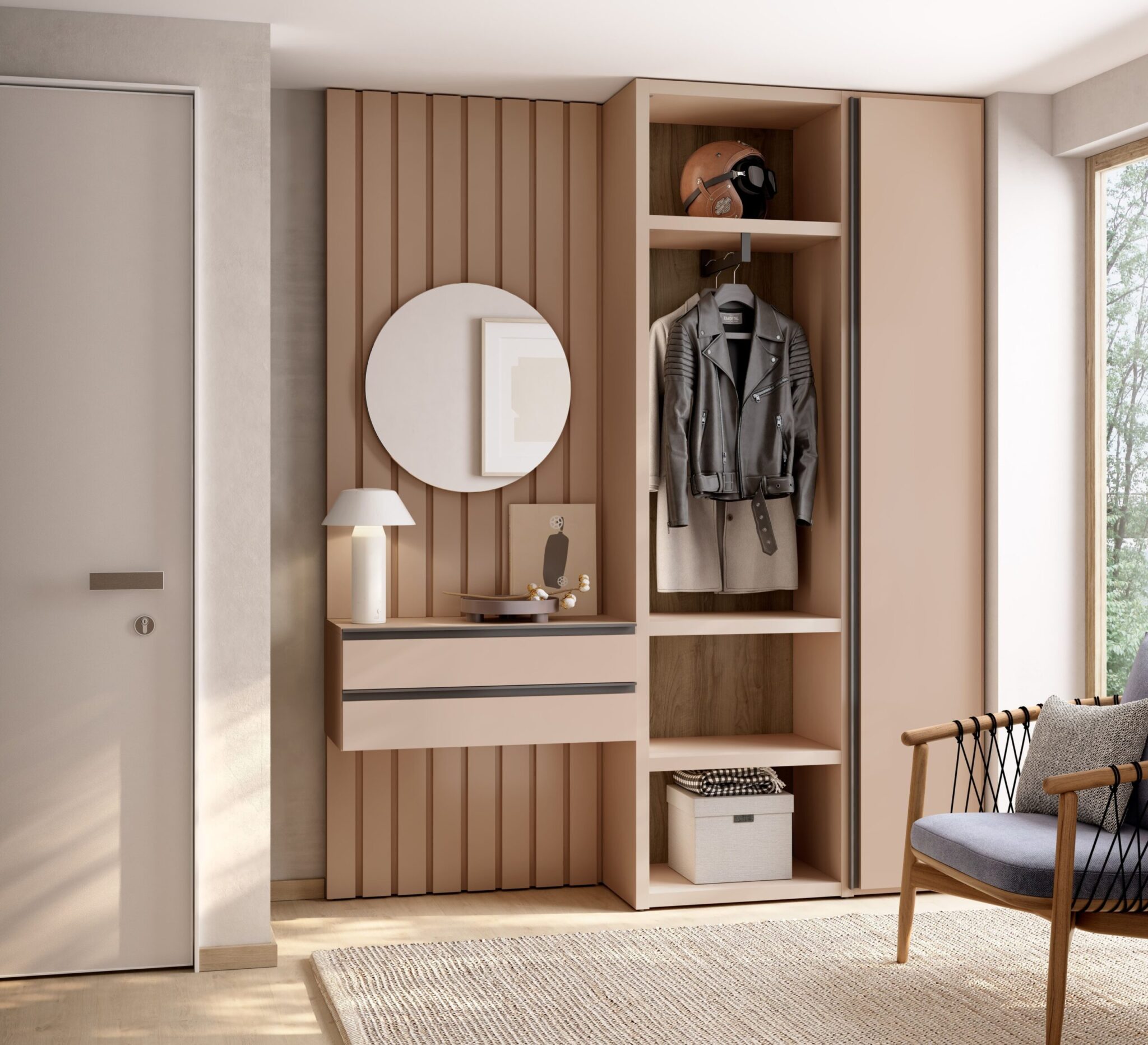 Completa composición de entrada a medida con armario, estantes con colgador y cajones con panel trasero alistonado y espejo redondo, acabado en laca color rosa palo, posibilidad de diferentes medidas