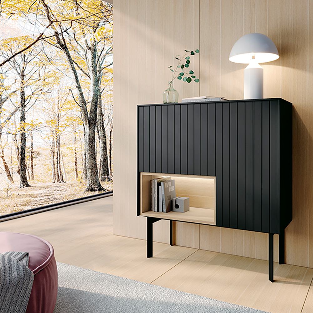 Mueble auxiliar aparador con puertas listones en color negro, hueco con luz led en acabado de madera natural y patas altas metálicas en negro