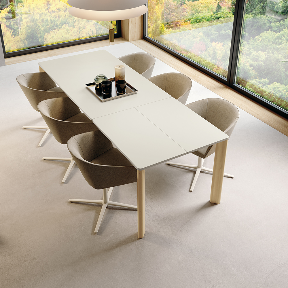 Mesa de comedor extensible con cuatro patas rectas en laca acabado champan con seis sillones con pata central giratoria