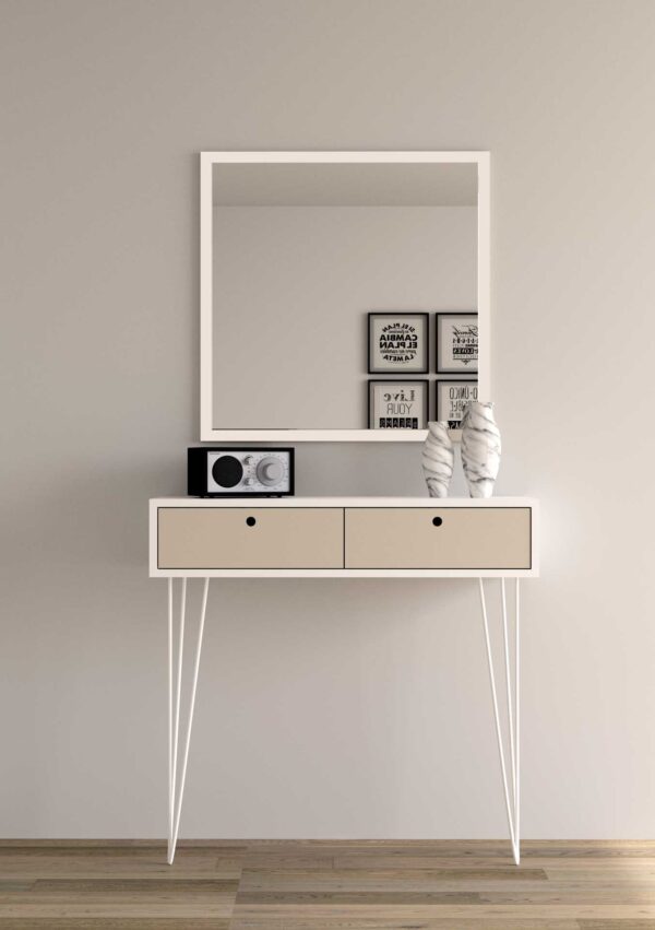 Consola con 2 cajones, patas metálicas blancas y espejo cuadrado a juego