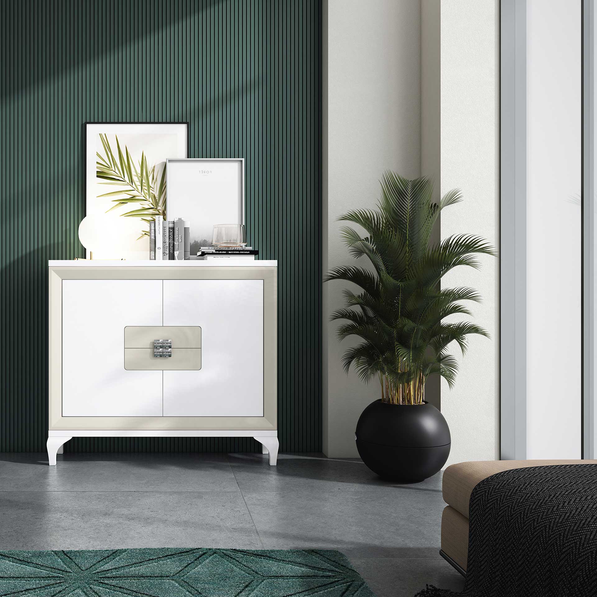 Zapatero linea clásica con dos puertas y cajones pequeños centrales, combinado en color blanco y plata, con patas