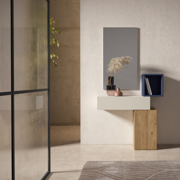 Mueble de entrada compuesto por módulos abiertos y cerrados en diferentes acabados, con espejo rectangular