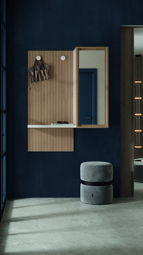 Mueble entrada con panel palillería, módulo con puerta de espejo, colgadores y repisa combinada en blanco, a medida