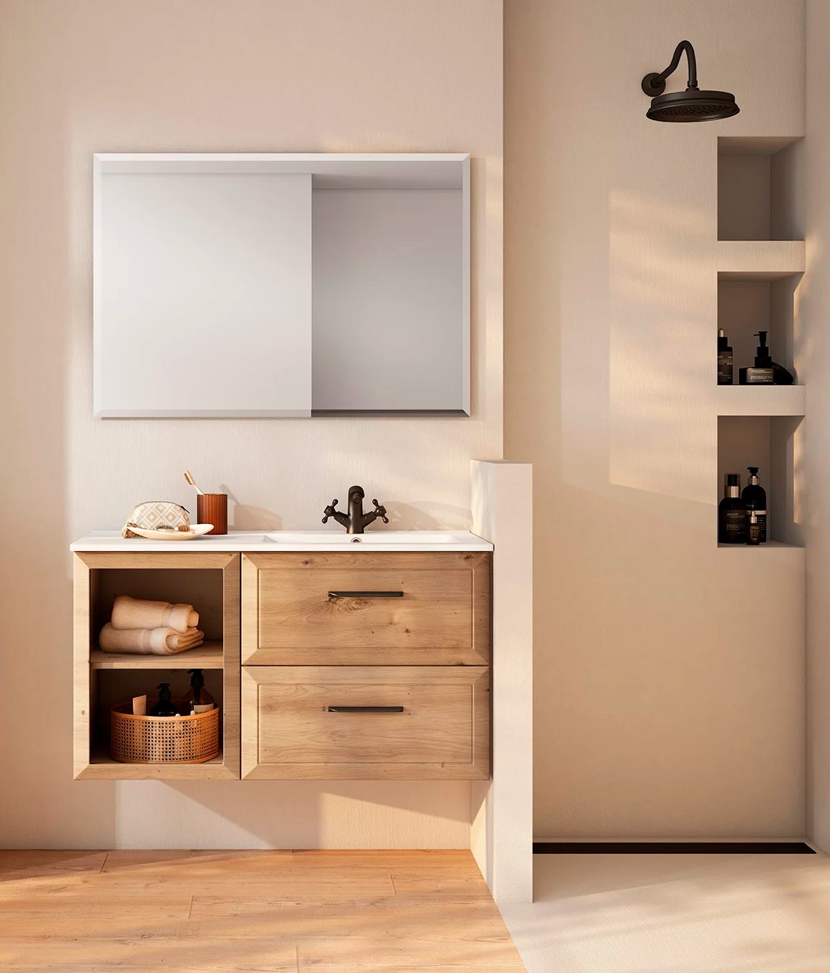 Mueble de baño con 2 cajones y estantes, encimera blanca con lavabo desplazado, espejo rectangular