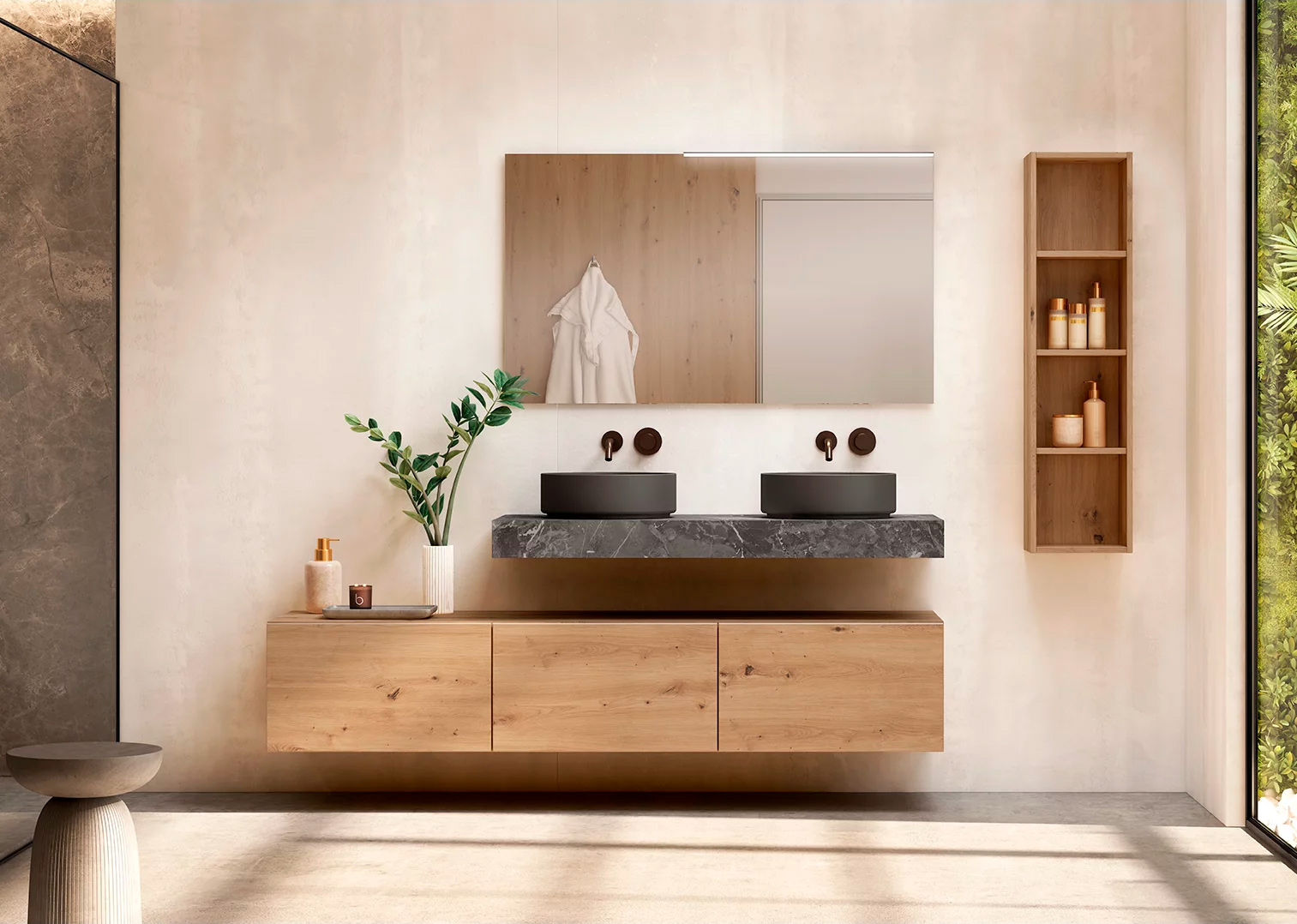 Mueble de baño con 3 cajones contenedores, encimera elevada con 2 lavabos a juego, con estante de colgar, acabado madera rústico y negro, espejo rectangular gran formato