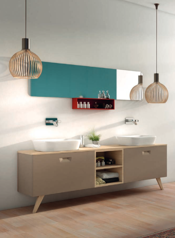 Mueble baño con patas, 2 puertas y hueco con estante, acabado en madera natural y color moka, con 2 lavabos a juego, espejo rectangular horizontal