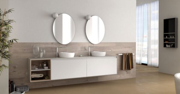Mueble baño lineal colgado con 2 lavabos, acabado blanco con zona estante color madera roble
