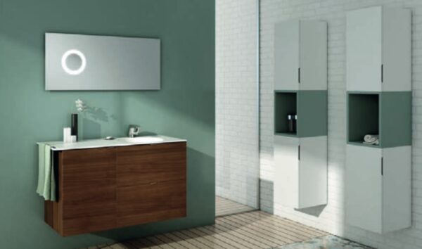 Mueble baño colgado en color madera y encimera blanca, espejo rectangular y dos columnas de almacenaje a juego en color blanco.