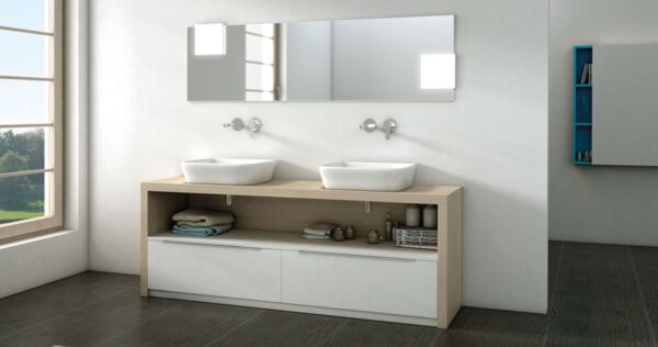Mueble baño doble con 2 contenedores y estante, acabado en color blanco y madera natural, con 2 lavabos a juego