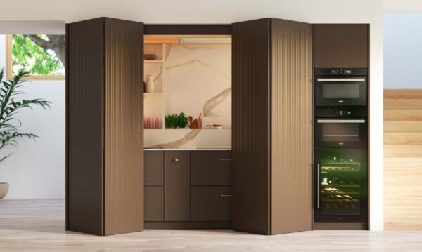 Cocina con puertas plegables de ocultación para espacios reducidos, a medida