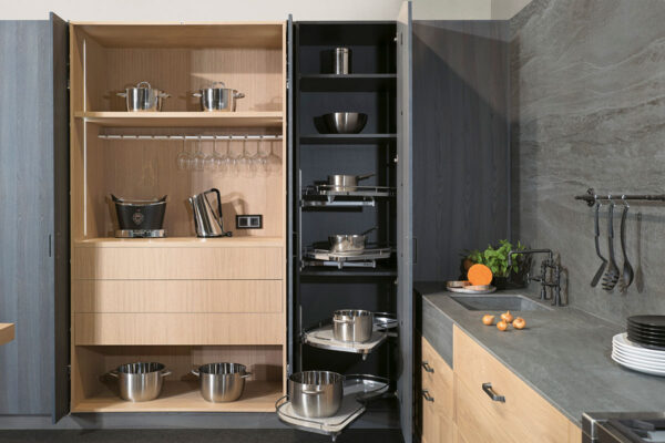 Detalle mueble rincón con sistema extraible de almacenaje con zona de almacenaje con puertas escamoteables