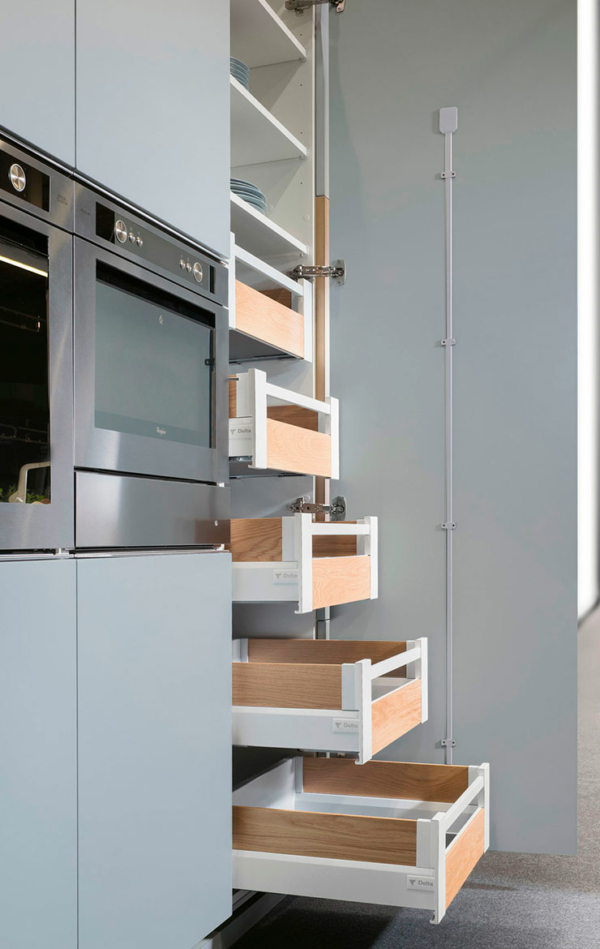 Detalle interior de mueble despensero con cajones XL extraibles y estantes superiores.