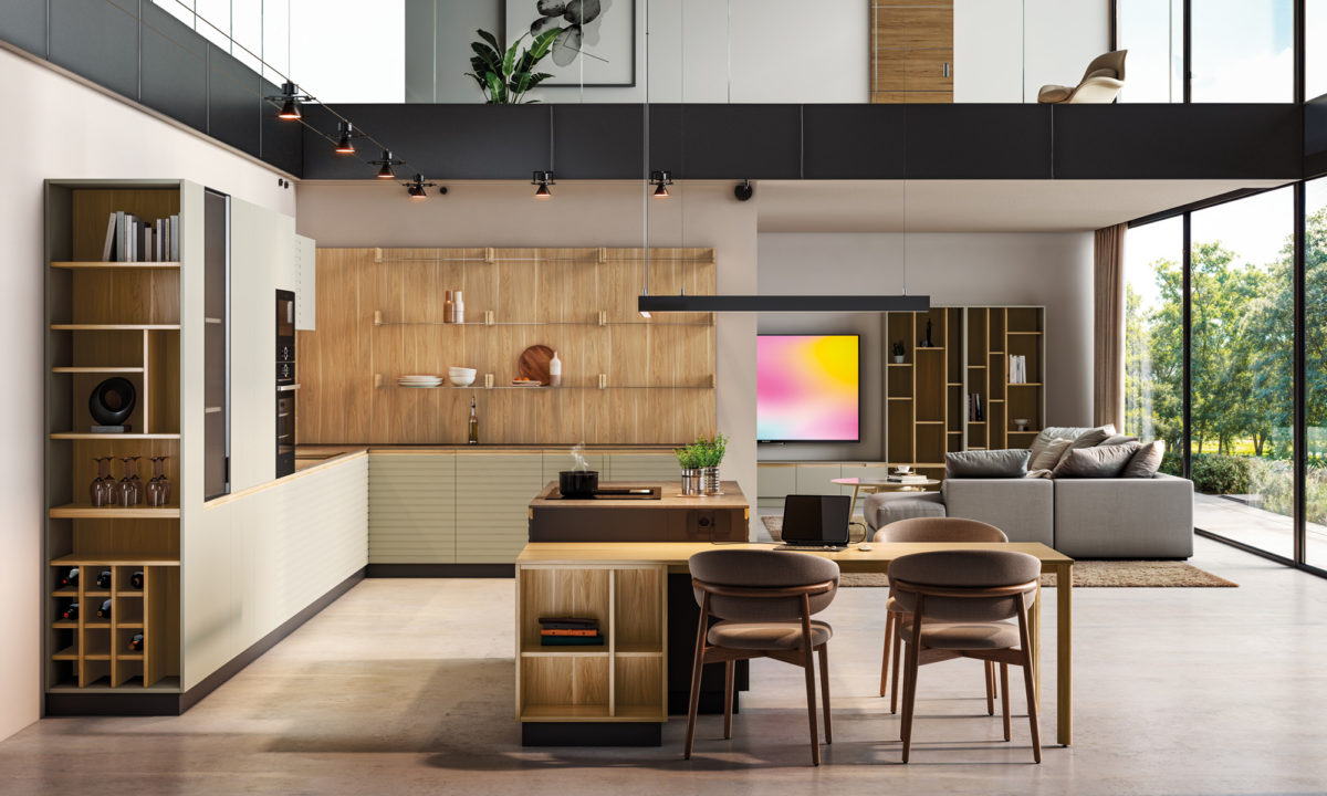 Cocina líneas rectas con zona de columnas y estantes con paneles, isla con mesa
