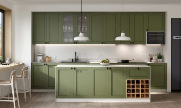 Cocina recta de estilo rústico con puerta enmarcada, color verde, tiradores redondos, detalle de vinoteca en mueble bajo.
