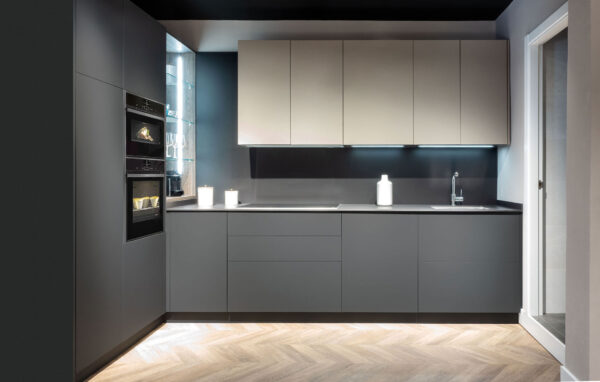 Cocina en forma de L, con bajo y zona de almacenamiento en gris oscuro, con electrodomésticos integrados, altos en color arena, sin tradores
