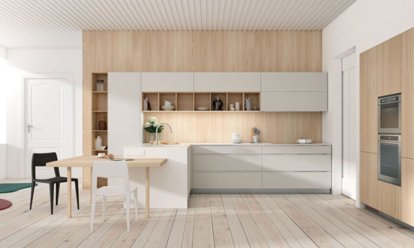 Cocina líneas rectas, laminado en blanco y detalles de cubos en acabado madera natural, con península y zona de almacenaje