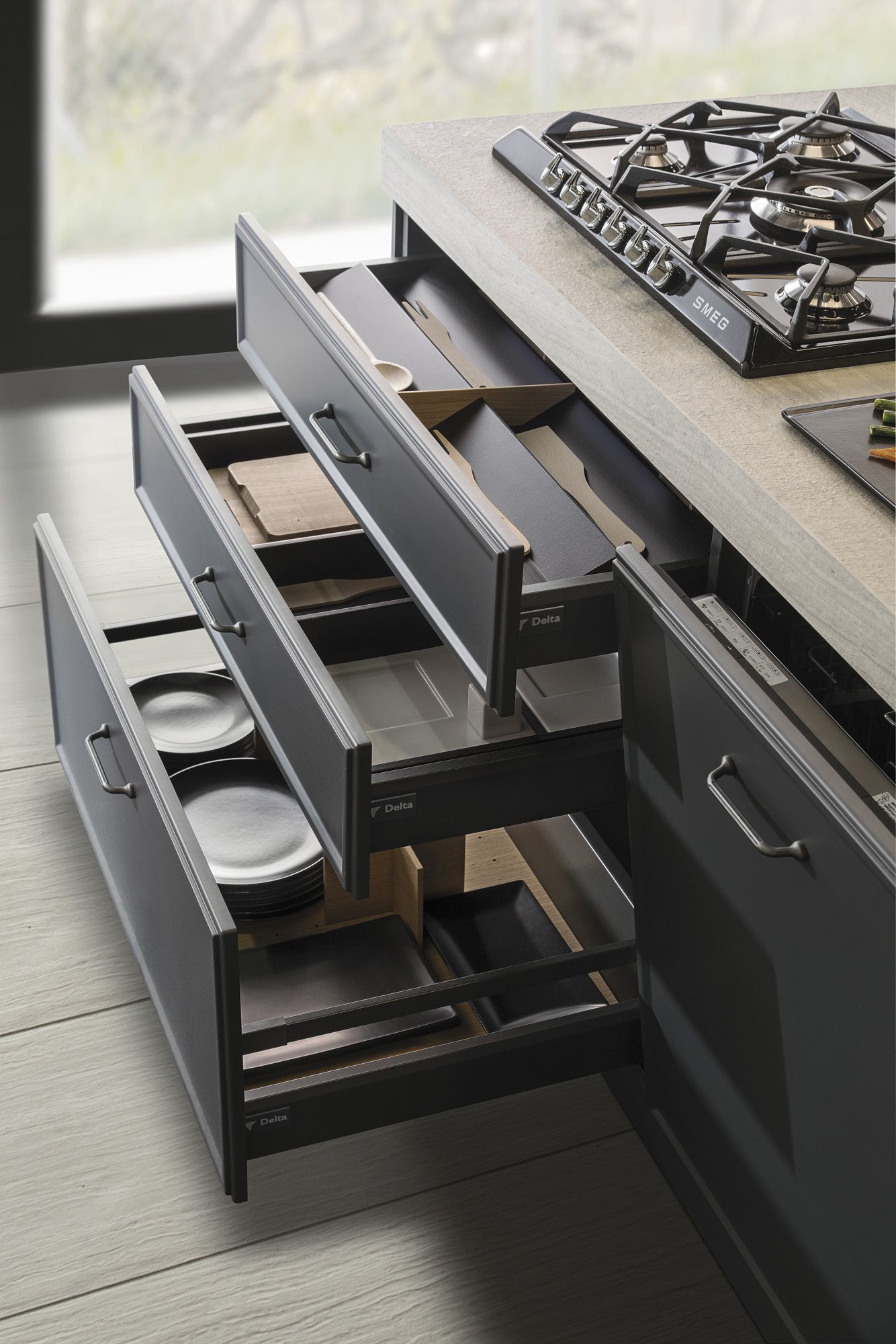 Detalle isla con mueble con 2 cajones y contenedor de gran capacidad, y lavavajillas con puerta integrada a juego