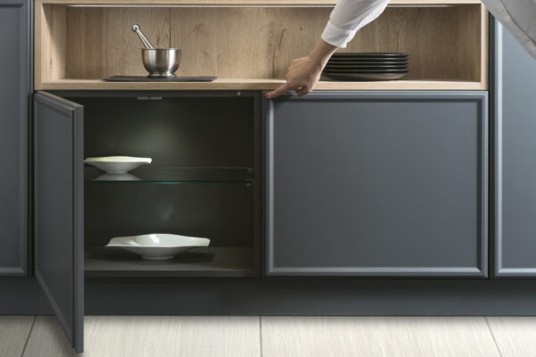 Detalle cocina lacada, puertas apertura sistema push, interior con luz y estantes de cristal
