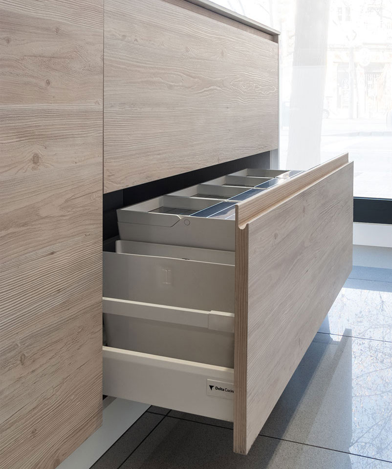 Detalle cajón contenedor cubos de residuos, acabado laminado color madera roble natural