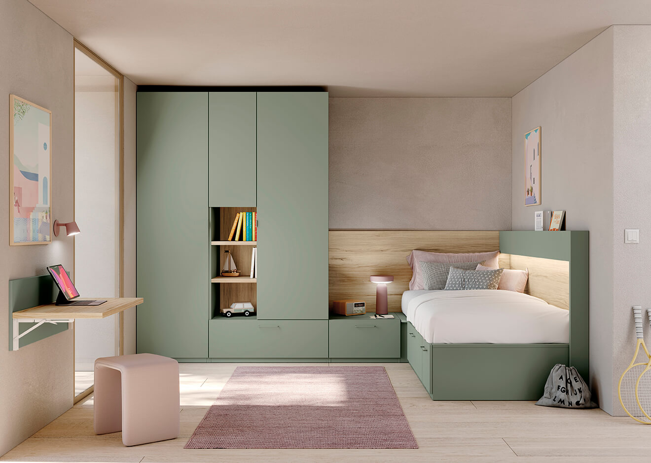 Dormitorio juvenil con cama nido trasera con panel de luz led, armario con estantes y mesa de estudio abatible