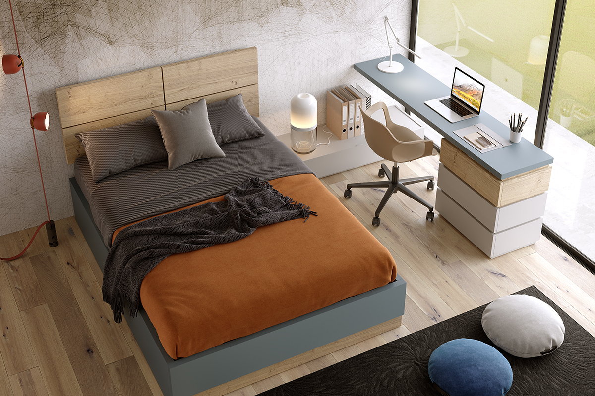 Dormitorio con zona de estudio en rincón, con cabecero alto y bancada combinada a dos colores, mesilla baja y mesa de estudio con cajonera