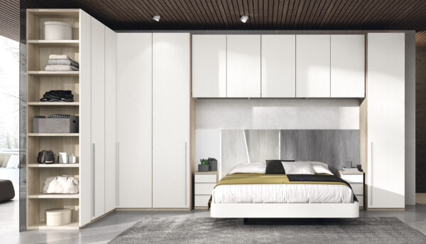 Completo dormitorio con conjunto de armarios en rincón,distribución interior a medida, muebles altos en puente y cama completa con bancada, mesillas pequeñas a juego