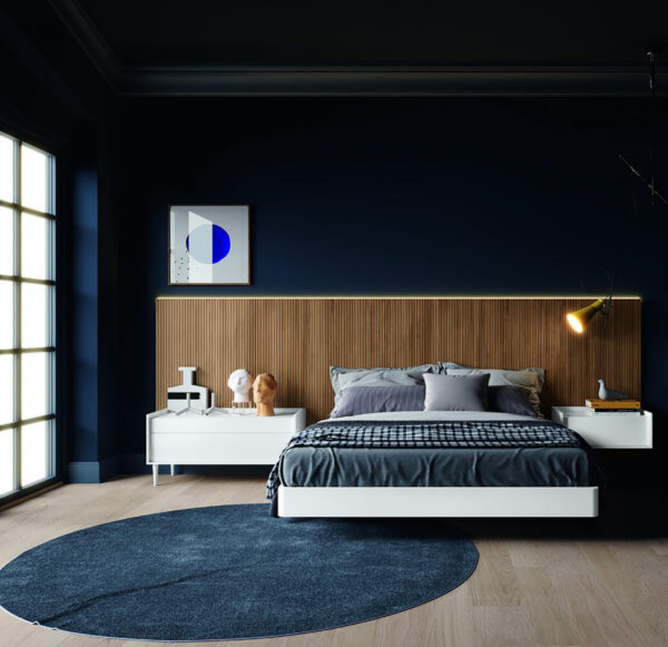 Dormitorio matrimonio con cabecero corrido con palillería en chapa de madera y luces led. mesillas y bancada en color blanco. diferentes posibilidades de medidas de mesillas