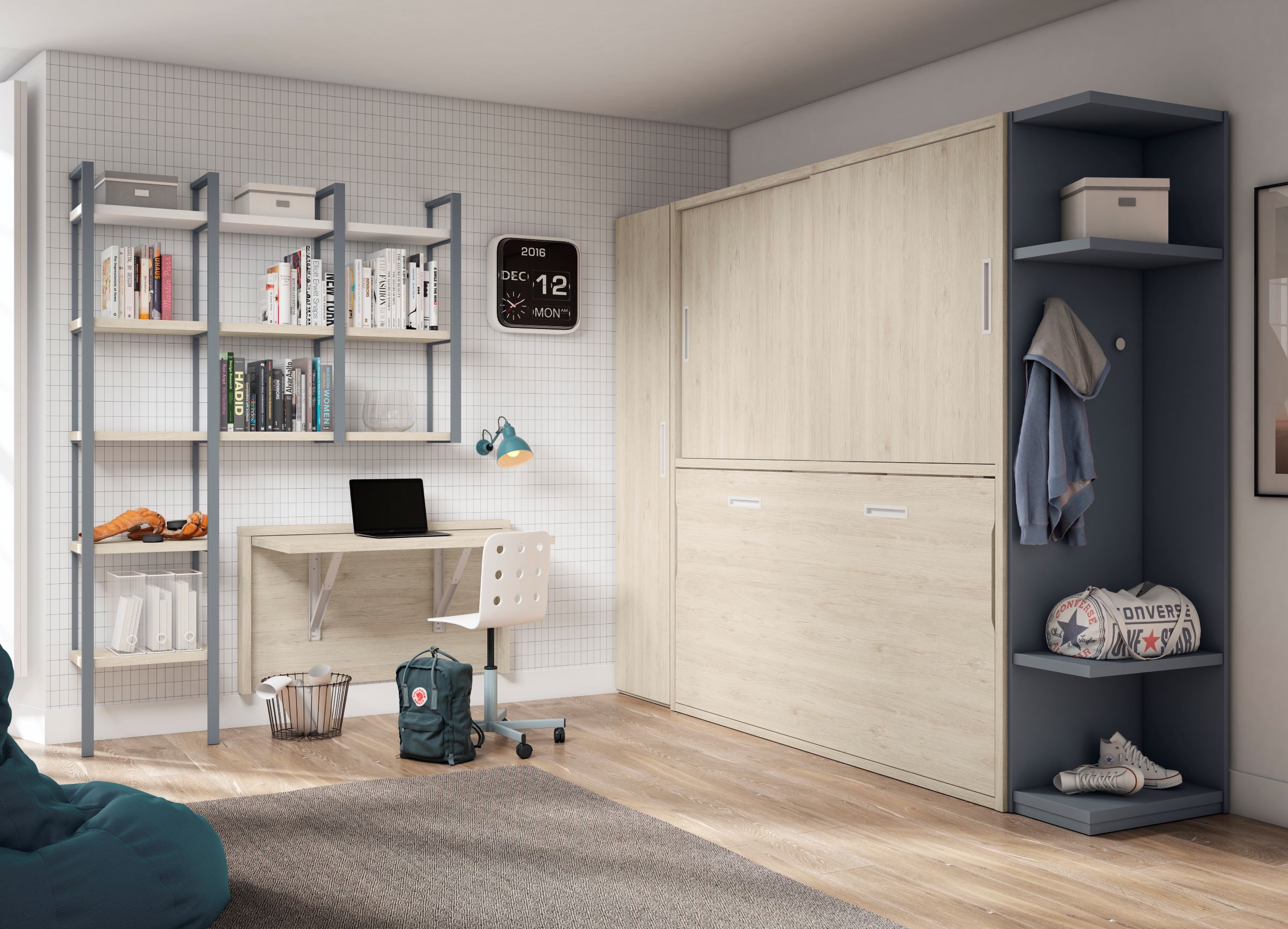 Dormitorio juvenil compacto compuesto por armario, cama abatible individual, altillo puente y terminal vestidor. Zona de estudio con estanterías a medida. Posibilidad de medidas y acabados