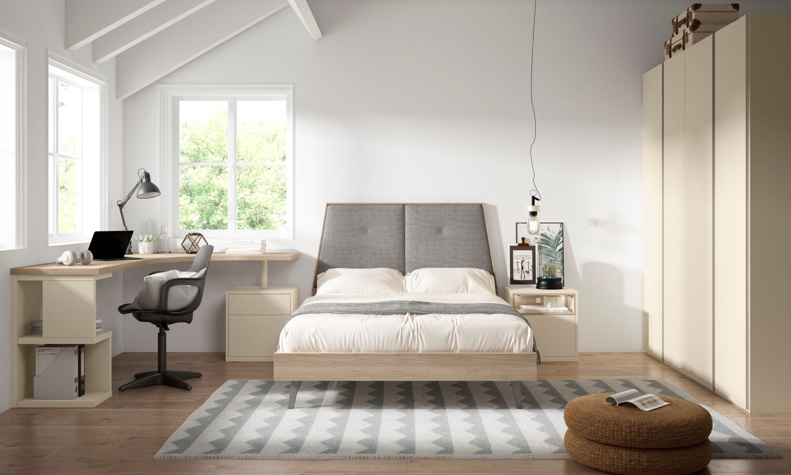 Dormitorio completo con armario, cama doble y zona de trabajo en esquina, cabecero tapizado. armarios y zona de trabajo a medida. variedad de acabados y combinación de colores