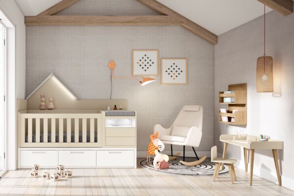 Dormitorio juvenil con cuna convertible en cama para acompañar al niño en su crecimiento. variedad de colores y acabados