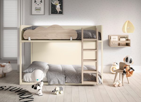 Dormitorio infantil con literas, cama inferior altura de suelo. escalera y quita miedos posicionable. diferentes acabados a elegir.