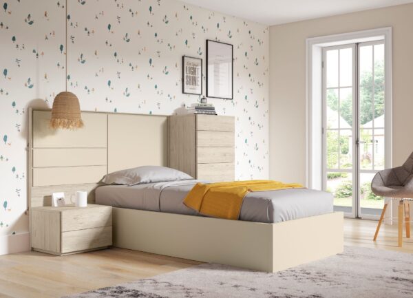 Dormitorio con cabecero corrido y sinfonier a medida, canapé arcón abatible