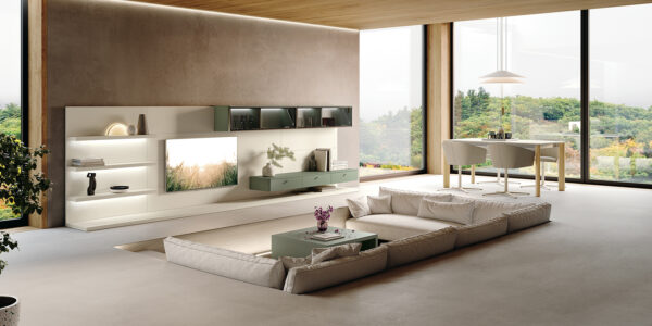 Mueble de salón moderno con paneles decorativos, estantes y cajones, combinado en 2 acabados color hueso y verde. Opciones de medidas para personalizar el diseño, variedad de acabados de colores y texturas.