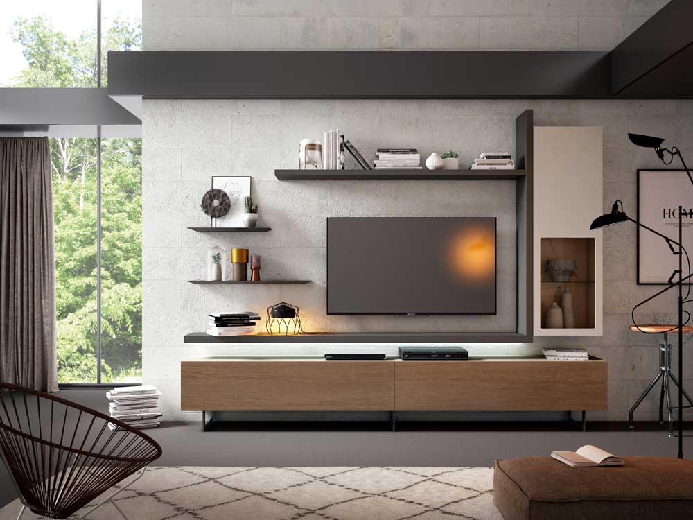 Mueble salón con módulos bajos con patas metálicas, estantes y modulo de colgar con puerta combinada madera y cristal, combinado en 3 colores gris, arena y madera