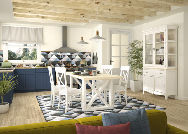 Comedor línea rustica en acabado blanco y encimeras en color natural, compuesto por vitrina y mesa comedor con sillas