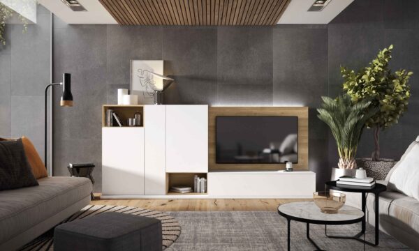 Mueble salón compacto con módulo tv con trasera combinada y conjunto de módulos de puertas y huecos, combinada en madera y blanco