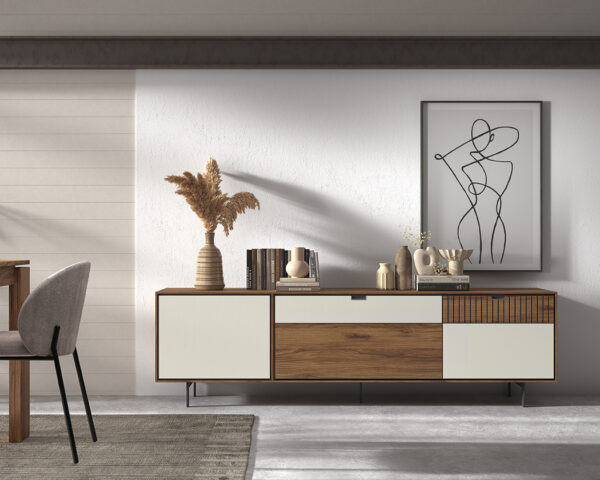 Mueble aparador con patas altas de hierro en color negro acabado color madera y champan, diferentes composiciones de módulos de cajones y puertas
