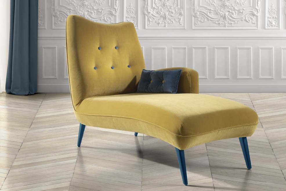 Diván con 1 brazo tapizado en mostaza con patas y detalles en azul, diferentes tejidos a elegir