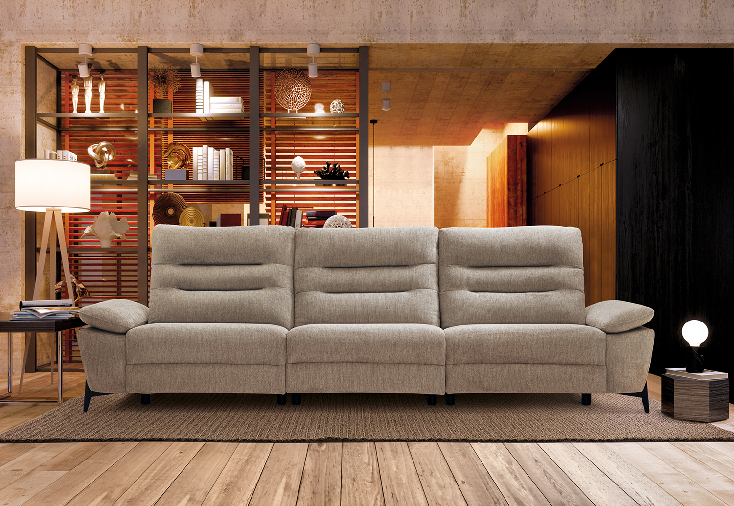 Sofá 4 plazas, 3 asientos, respaldo alto, brazo siesta, diferentes medidas y acabados a elegir